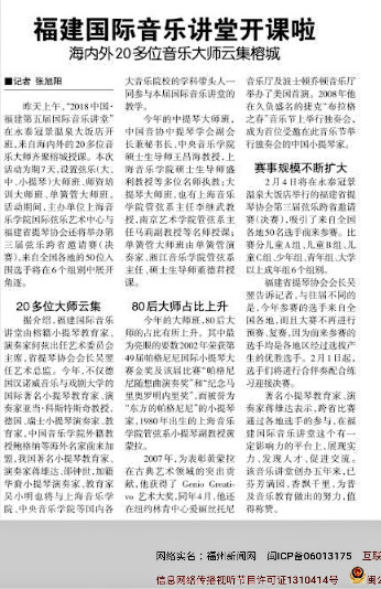 2018中国福建第五届国际音乐讲堂精彩继续,今天福建晚报、海峡都市报、福州新闻网东南网等多家主流媒体也报道了此次活动,音乐讲堂创办五年以来,这优秀音乐教育平台影响力与关注度已越来越大,为普及音乐教育做出了意义深远的贡献。