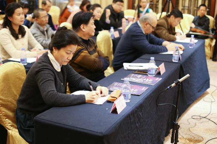 专家评审们认真仔细地对选手的音准、节奏、技巧处理作出评价,并进行现场打分。