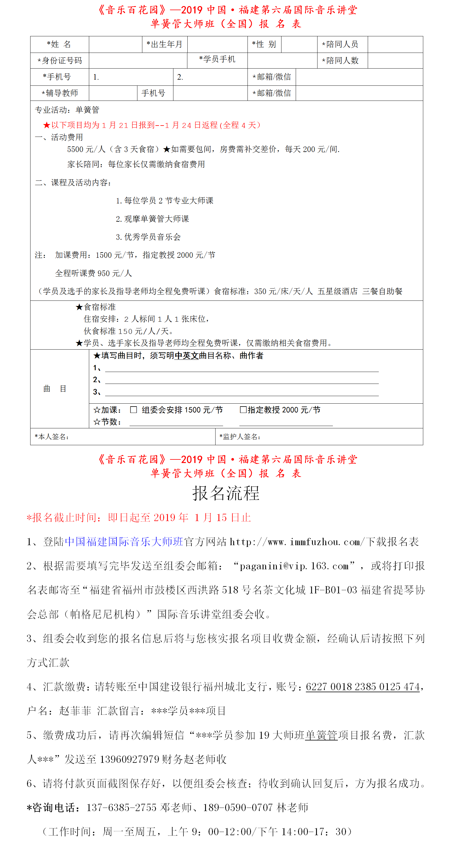 “音乐百花园”—2019中国·福建国际音乐讲堂单簧管大师班报名表