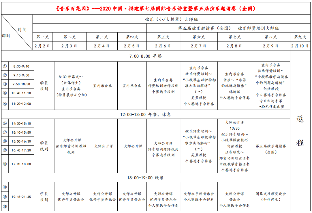 本届讲堂将邀请50余位来自国内外著名专家对两百多名学员进行公开大师课、室内乐合奏训练课、优秀学员音乐会、多场专业学术讲座及弦乐师资培训班。