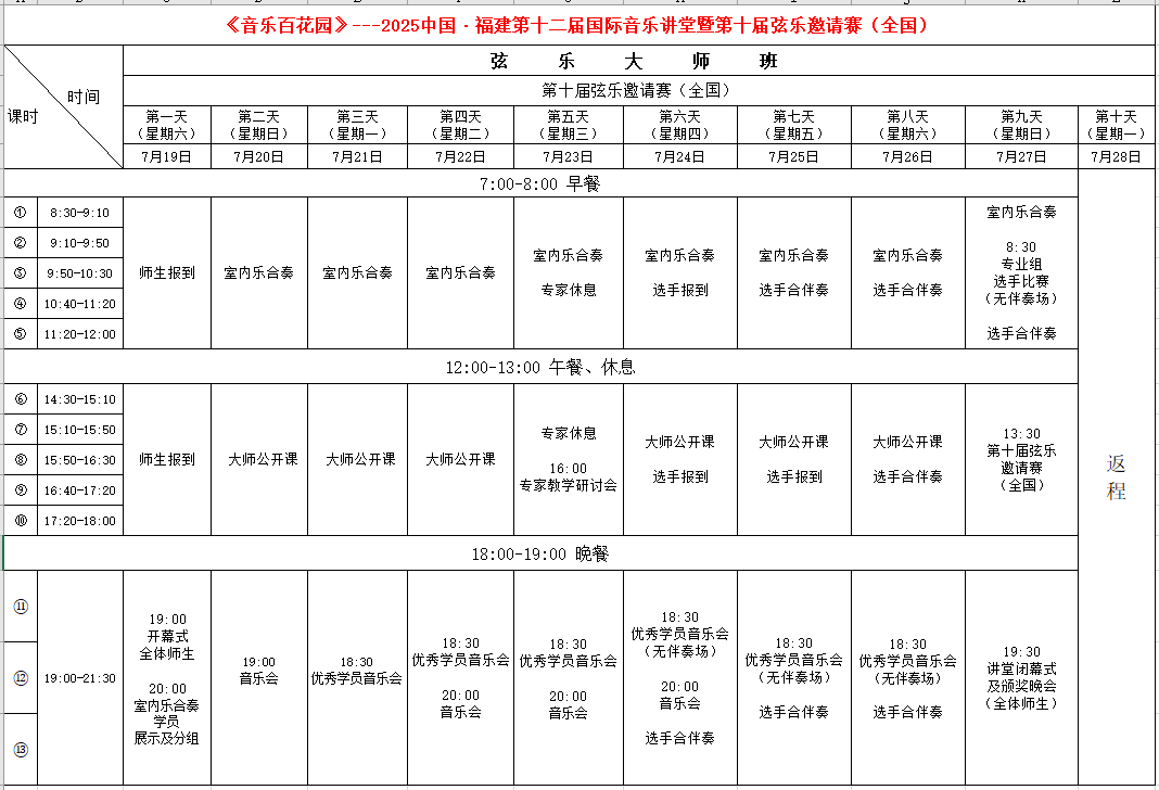 活动安排:观摩大师课/室内乐合奏训练课/营地内音乐会/比赛/闭幕式及颁奖晚会